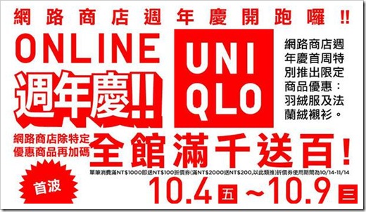 Uniqlo-網路商店週年慶 全館滿千送百: