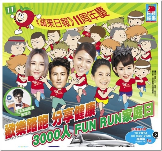 喜歡路跑的朋友趕快看過來!!【蘋果日報】要你來來來 跑跑跑就能抽轎車,附上5個《蘋果日報》報頭,免繳報名費即可報名~~5月24將在馬場町紀念公園舉辦「3000人FUN RUN家庭日」全程3公里,由Janet、瑤瑤、林又立、蕭亞軒、吳克群帶頭領跑,蕭煌奇也到場獻聲演唱