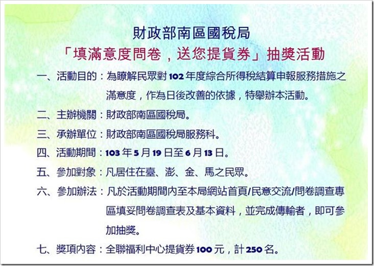 喜歡抽獎的朋友有福囉~~南區國稅局填滿意度問卷,就可以抽獎全聯提貨券,05/19起全台民眾皆可參加喔!
