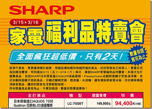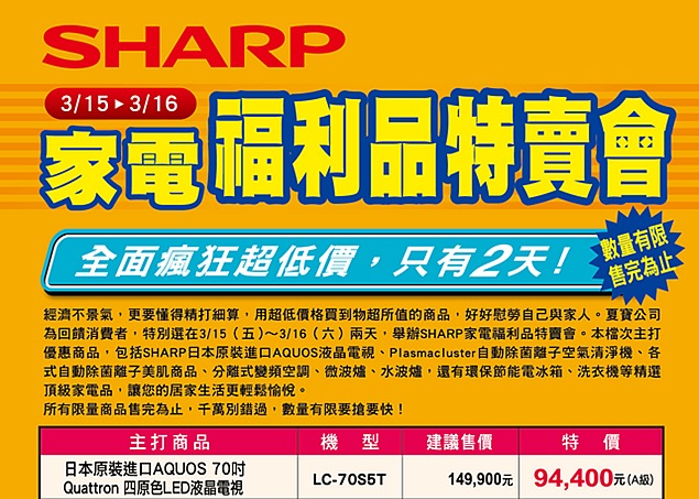SHARP家電特賣會3/15(五)~3/16(六),只有二天。 台北市光復北路11巷31號