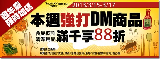 本週DM主打商品-Yahoo!奇摩購物中心,量販特賣品滿1000元就打88折2013.3.15~2013.3.17http://buy.yahoo.com.tw