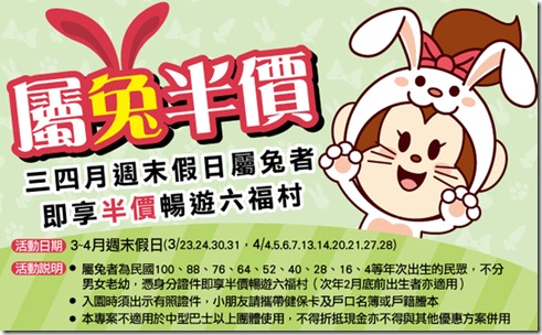 官方網站:六福村主題樂園-3、4月週末假日 屬兔者半價
