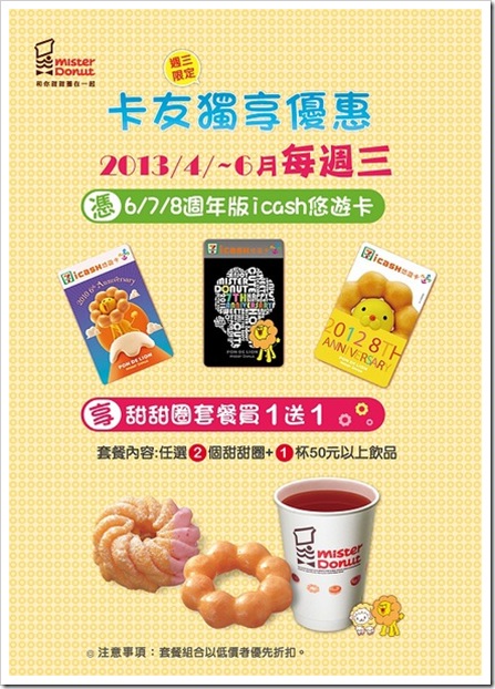 活動網頁:Mister Donut-週三卡友優惠日 甜甜圈套餐買一送一