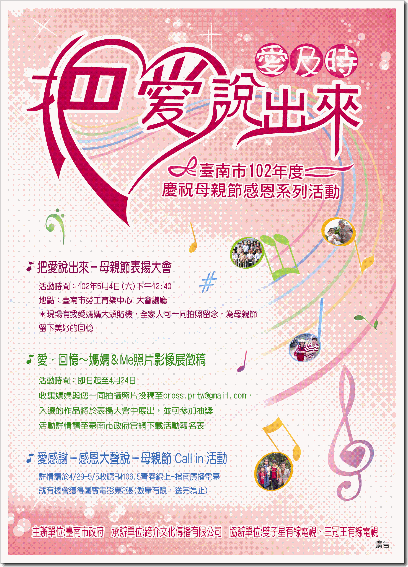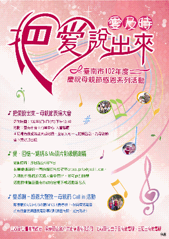 ◎獎勵方式:入選作品將於5月4日「愛及時-把愛說出來~母親節表揚大會」中展出,並有機會抽得SAMPO聲寶甜甜圈音樂按摩枕大獎。