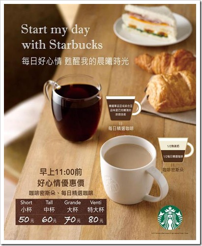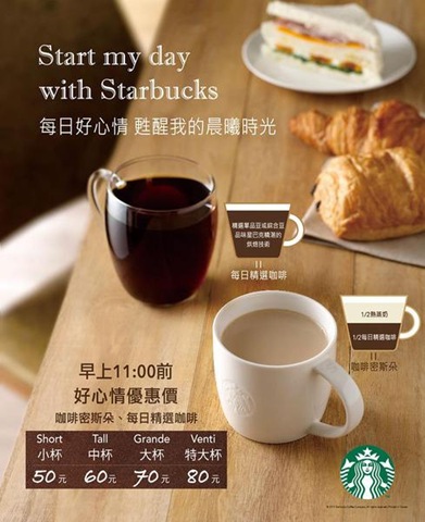 星巴克咖啡館-晨曦咖啡時光 11點前密斯朵優惠價: