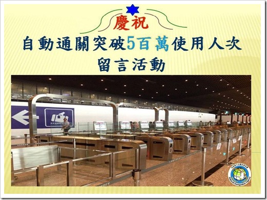 自動通關也有獎!移民署金門辦事處表示,該署為慶祝自動通關突破五百萬人次,6月17日(週一)起至7月17日(週三)止將進行使用留言活動,送出隨身碟等相關贈品,歡迎民眾多多利用、上網抽獎,並踴躍申辦自動通關認證,便捷入出境通關手續!活動7月19日(週五)進行抽獎及公布得獎者,得獎人除會發佈於發燒網會網頁,另該署全球資訊網及「我愛自動通關」FB粉絲專頁亦會公布得獎者名單。