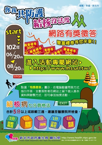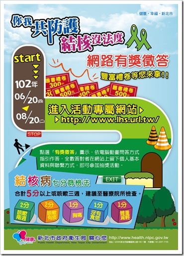 新北市政府衛生局即日起至8月20日推出結核病防治網路有獎徵答活動,依學齡共分為國小、國中、高中職及大專與社會組等4大組別,只要進入衛生局網站或「你我共防護˙結核沒法度」網站加入會員作答,全數答對即可參加抽獎,獎項計有500份圖書禮券,總獎金達21萬元。